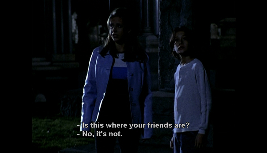 The most significant parallel comes when Buffy and Billy are running from the Ugly Man in the school, escape through a hedge, and come out the other side in a graveyard. Like many examples in Restless, it’s a sudden shift of location that makes sense only in dreams. And Billy asks Buffy – is this where they’ll find her friends?