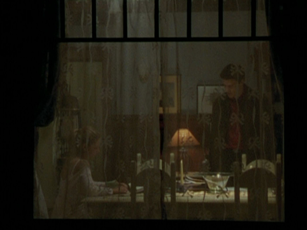 It is useful for Buffy that he does eventually share the information, and not just because of what it tells her about Drusilla. It is most useful in what it tells her about Angelus. Because of this, she knows what he is capable of, and how his obsessions with certain women drive him to concentrate all his evil upon them. It is a reminder of Drusilla’s purpose as a potential future Buffy, and in retrospect, a reminder of where the season will go. That is most clear when the camera pans out, showing us a voyeuristic glimpse of Buffy and Angel through the net curtains – a shot that rhymes sickly with one of the most haunting scenes in this season, at the end of Passion.