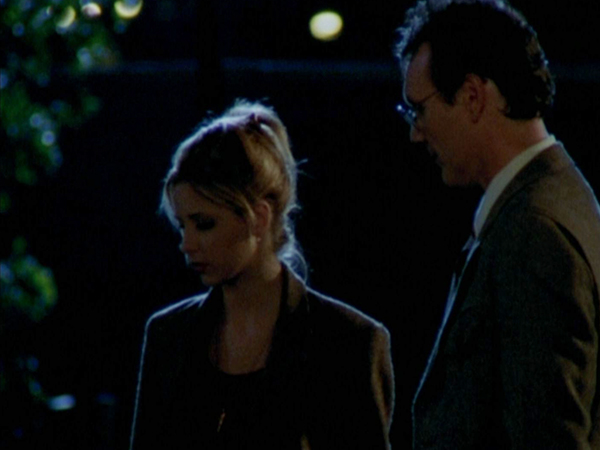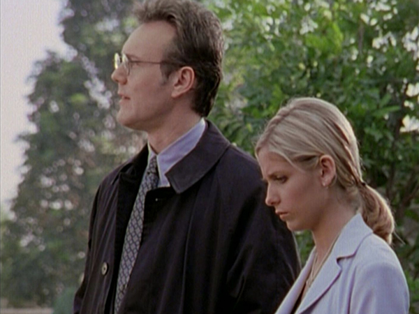 Ford does succeed in writing himself into a story in one way, but it’s not as a tragic hero. It’s as the villain – specifically, as the main villain of season two, Angelus. We are introduced to him as an older guy that Buffy had a crush on, who didn’t date her because she was younger. She tells us that she “moped for months” over him. Already, he is echoing Angel and giving us a jokey glimpse of Buffy’s final state after this season. He becomes the villain in this episode, and finally is killed by Buffy, even as she states sadly that despite everything, she does not hate him. Again, the show echoes forward to Passion, as Buffy and Giles stand together over a grave.