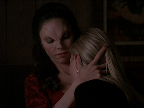 This expanding scope is made visible from the opening scene between Angel and Drusilla. We got a little glimpse of it in episode three, but this is when we really start to understand about the strange and twisted dynamic that exists within the infamous family/polycule that fandom has dubbed the “Fanged Four”, or occasionally “The Whirlwind” – the collective term for Darla, Angelus, Drusilla, and Spike. This episode was written in the wake of Interview With The Vampire, remember – it was inevitable that the Buffyverse would dip its toes into its own messed-up homo-erotic, vampiric family unit at some point.